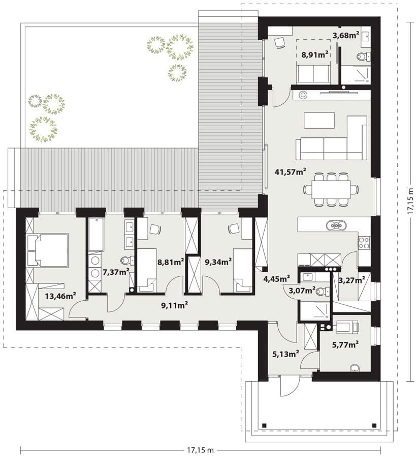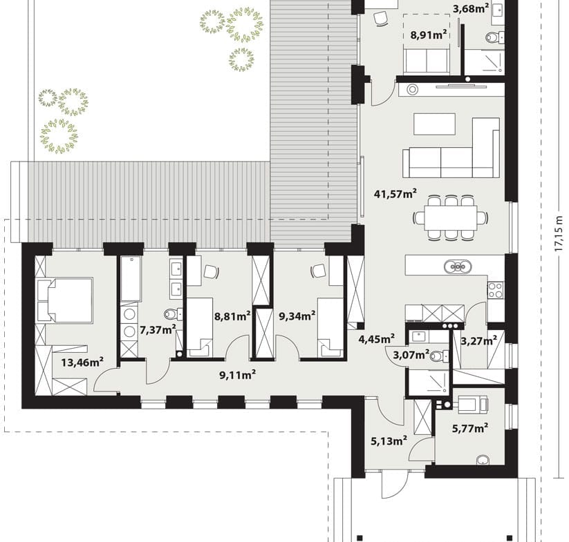 Stella är ett prefabricerat hus byggt av Domki Marysia, en prefabricerad tillverkare baserad i Polen. Detta prefabricerade hus har en boyta på 136 m², 4 sovrum och 2 badrum.