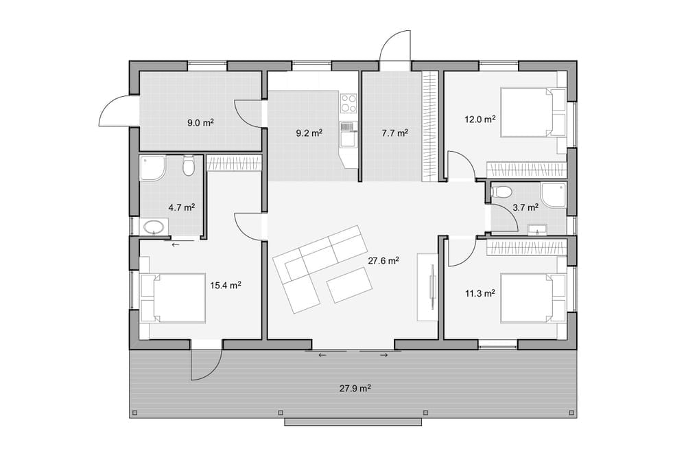 Staicele är ett prefabricerat hus med trästomme som byggts av Vitbuve, en tillverkare av prefabricerade hus i Lettland. Detta prefabricerade hus erbjuder 100,6 m2 boyta, med 3 sovrum och 2 badrum.