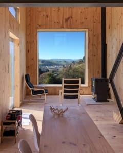 The building envelope, meanwhile, is fine-tuned for performance. CLT’s natural thermal mass, paired with high-quality insulation and ventilated glazing, ensures year-round comfort. The home is heated with locally sourced firewood, reinforcing its low-impact ethos.