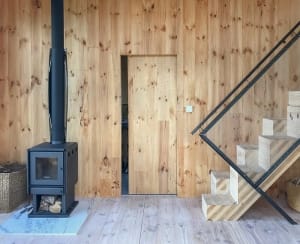 Even the cladding tells a story. Wrapped in corrugated metal, the cabin echoes the rural barns and sheds that dot the landscape — a subtle nod to local vernacular architecture, updated with a contemporary twist.