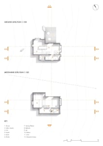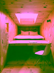 The main space serves multiple purposes: it’s a studio for creative work, a living area for relaxation, and a space to gather. Above, a mezzanine sleeping platform offers privacy while maintaining a connection to the rest of the cabin. Adjacent to the main room is a service spine that includes a bathroom and storage, topped by a flexible loft with a cozy lookout.
